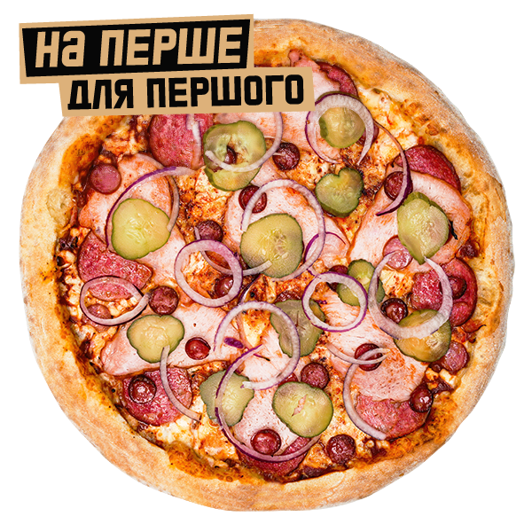 Cоус томатний, сир моцарела, шинка, салямі, мисливські ковбаски, огірки мариновані цибуля, чилі