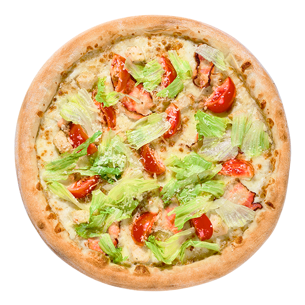 Соус цезар, сир моцарела, сир пармезан, курка, бекон, помідори чері, айсберг