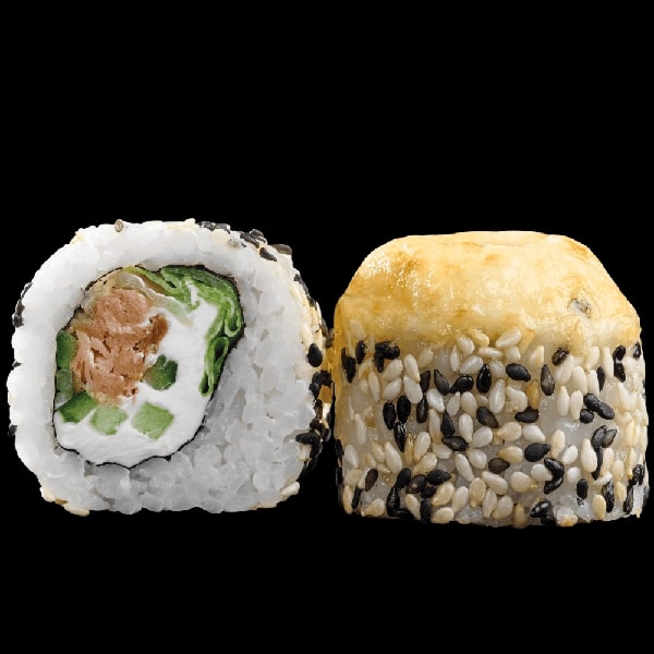 - З лососем — обсмажений лосось, кунжут, соуси Унагі та Сирний, сир Філадельфія. Класичний смак, який нікого не залишить байдужим.