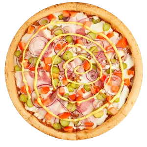 Base, tomato sauce, mozzarella cheese, salami, ham, hunting, pickling cucumber, onions, chili