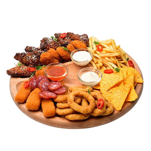Цибулеві кільця, нагетси, картопля фрі, начос, ковбаса папероні, сирні палички, куряче крило в соусі барбекю;