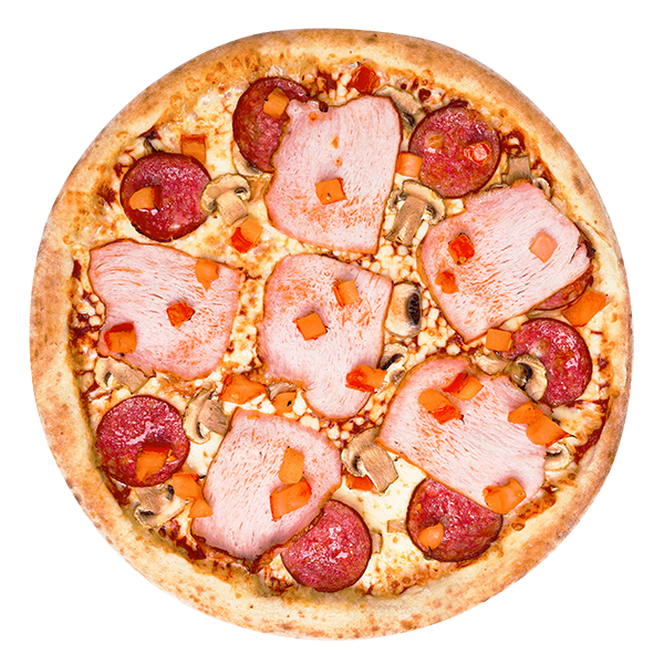 Соус томатний, сир моцарела, салямі, шинка, гриби, помідори