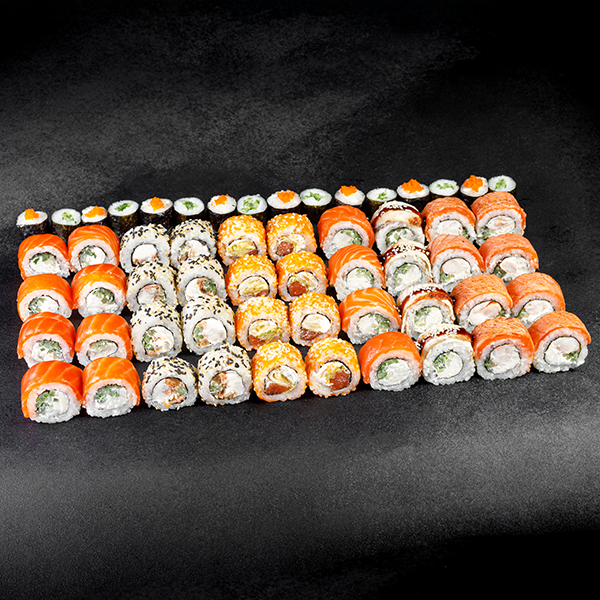 Кількість: 46 шт. Філадельфія з огірком, Філадельфія Комбо, Королівська Філадельфія, Боніто з лососем, Каліфорнія з лососем, Філадельфія Макі, Макі огірок