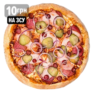 Base, tomato sauce, mozzarella cheese, salami, ham, hunting, pickling cucumber, onions, chili