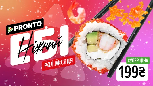Ніжний Ебі – це креветочка, засмажена в темпурі за компанію з авокадо в обіймах ніжної філадельфії ☺️ А навколо кожного сушика яскраві пружні ікринки піднімають настрій і додають свою смачну нотку. Це рол місяця, вартістю 199 грн 🍣