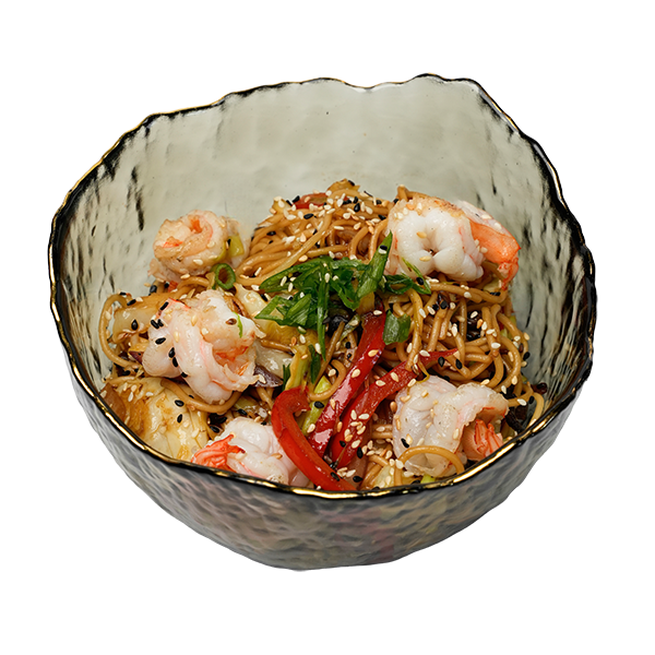 Капуста білокачанна, морква, цибуля синя, перець болгарський, гриби муер, сіль китайська, локшина удон, соус WOG, цибуля зелена, кунжут мікс, креветки