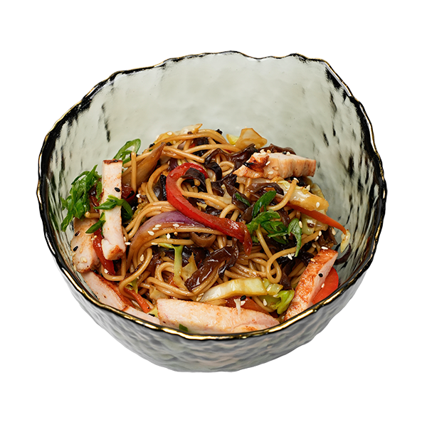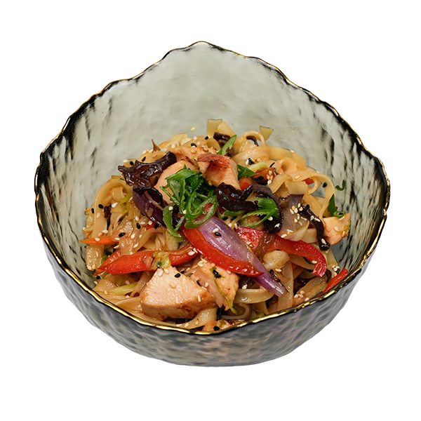 Куряче філе су-від, олія, китайська сіль, капуста, морква, цибуля синя, перець болгарський, гриби муер, рисова локшина, соус WOG, цибуля зелена, кунжут мікс