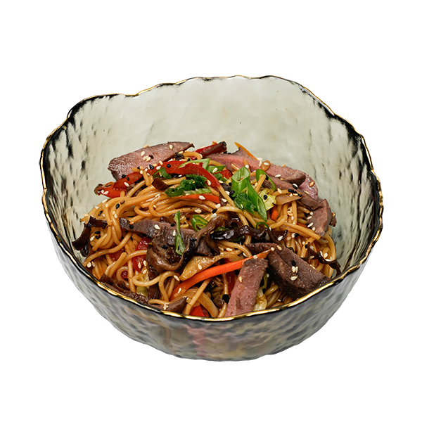 Капуста білокачанна, морква, цибуля синя, перець болгарський, гриби муер, сіль китайська, локшина удон, соус WOG, цибуля зелена, кунжут мікс, телятина су-від