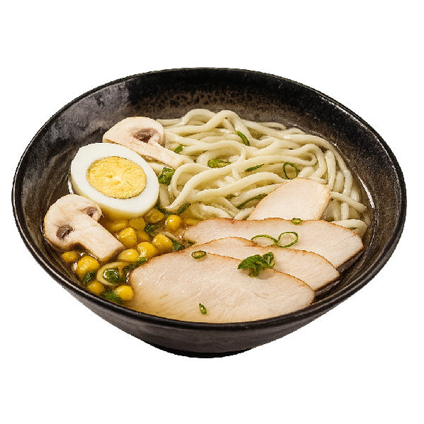 Концентрат рамен, вода, кукурудза, гриби, локшина удон ,куряче філе, кунжут, яйце перепелине, цибуля зелена