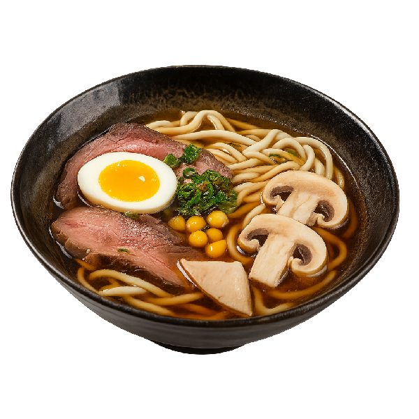 Концентрат рамен, вода, кукурудза, гриби, локшина удон , телятина, кунжут, яйце перепелине, цибуля зелена