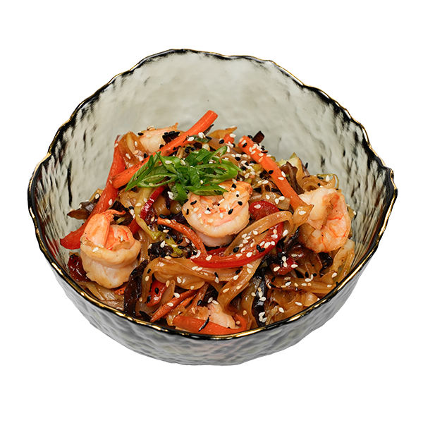 Креветка, олія, китайська сіль, капуста, морква, цибуля синя, перець болгарський, гриби муер, рисова локшина, соус WOG, цибуля зелена, кунжут мікс