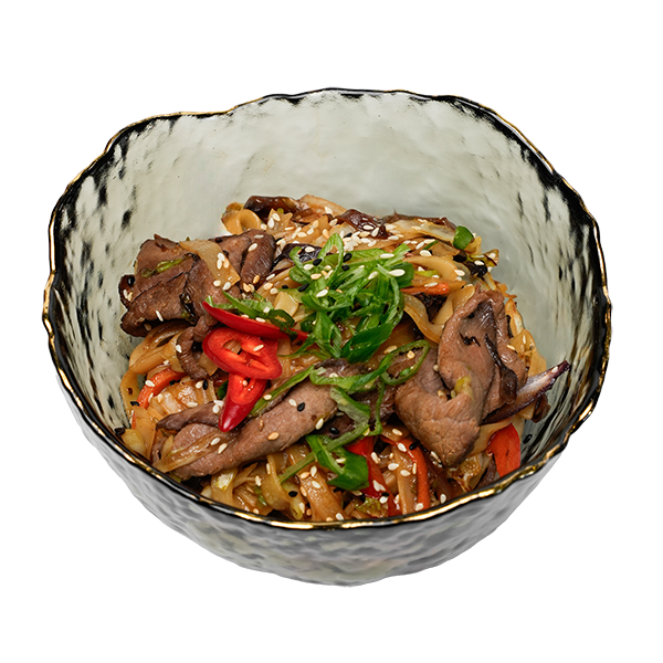 Телятина су-від, олія, китайська сіль, капуста, морква, цибуля синя, перець болгарський, гриби муер, рисова локшина, соус WOG, цибуля зелена, кунжут мікс, перець чилі гострий