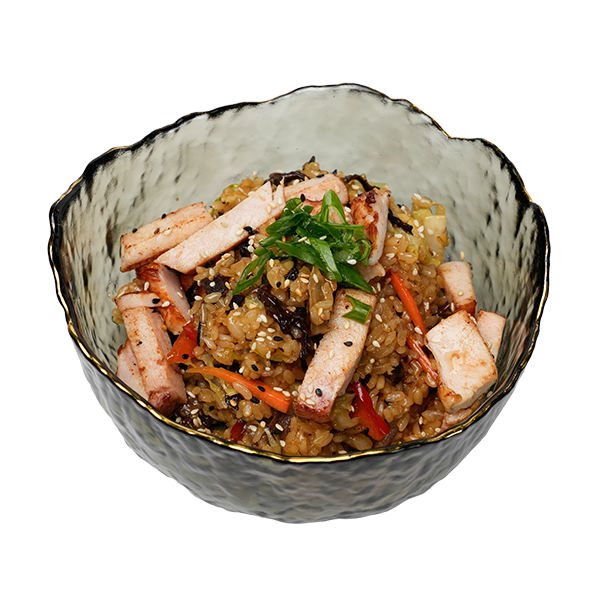 Капуста білокачанна, морква, цибуля синя, перець болгарський, гриби муер, сіль китайська, рис варений, соус WOG, цибуля зелена, кунжут мікс, креветки