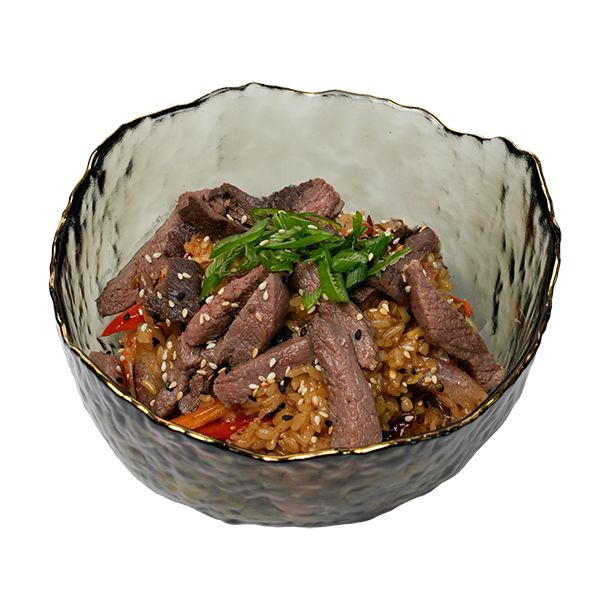 Капуста білокачанна, морква, цибуля синя, перець болгарський, гриби муер, сіль китайська, рис варений, соус WOG, цибуля зелена, кунжут мікс, телятина су-від